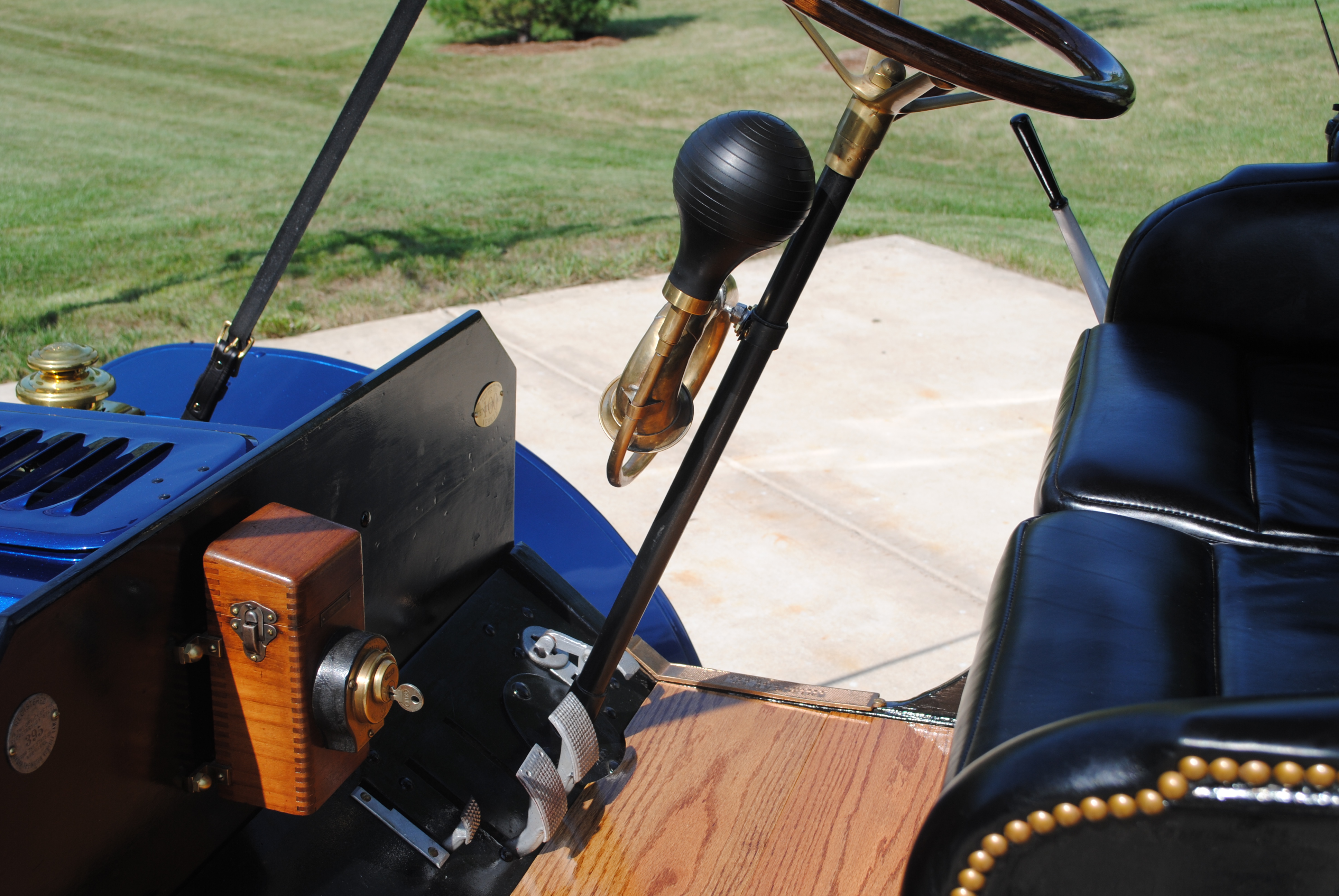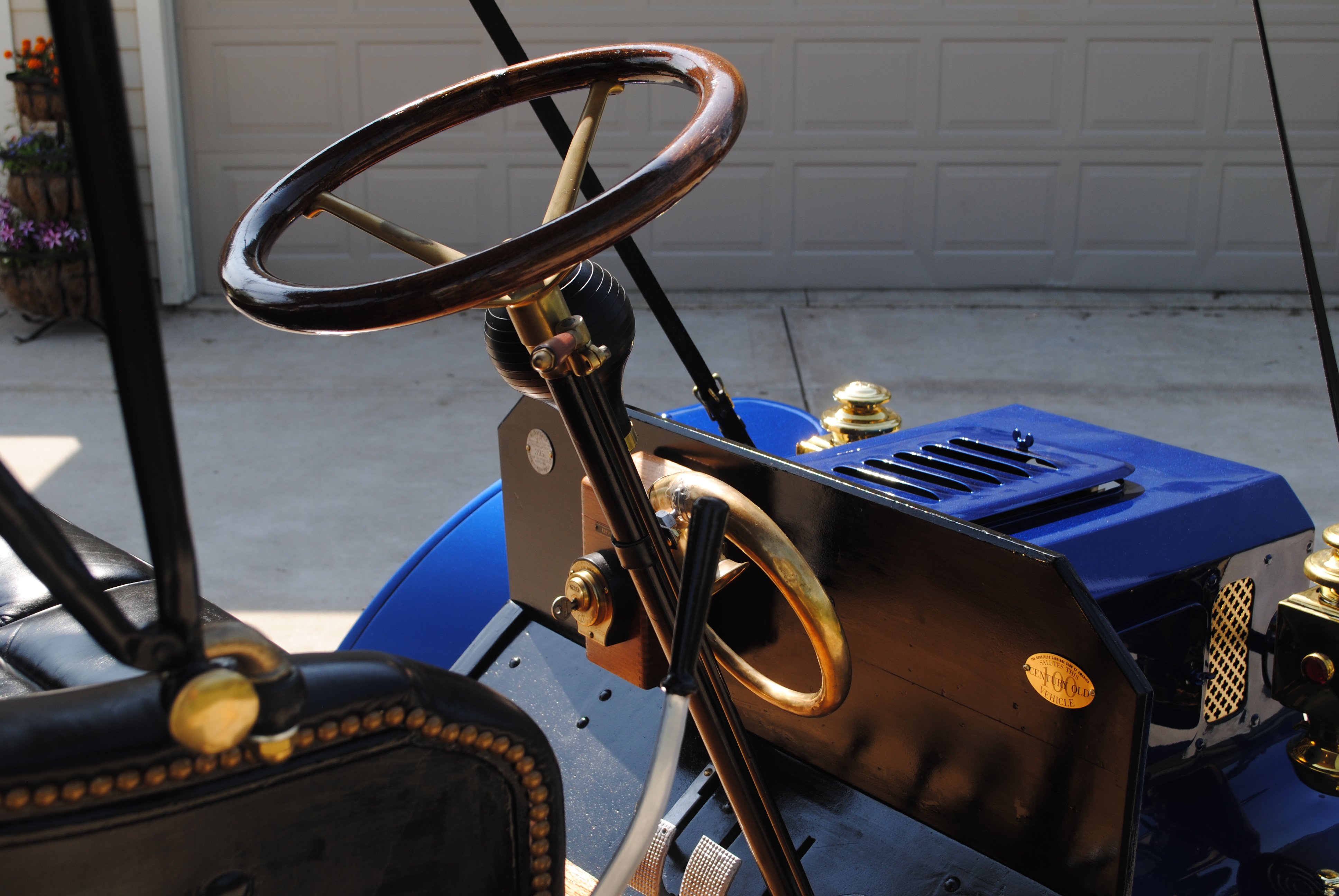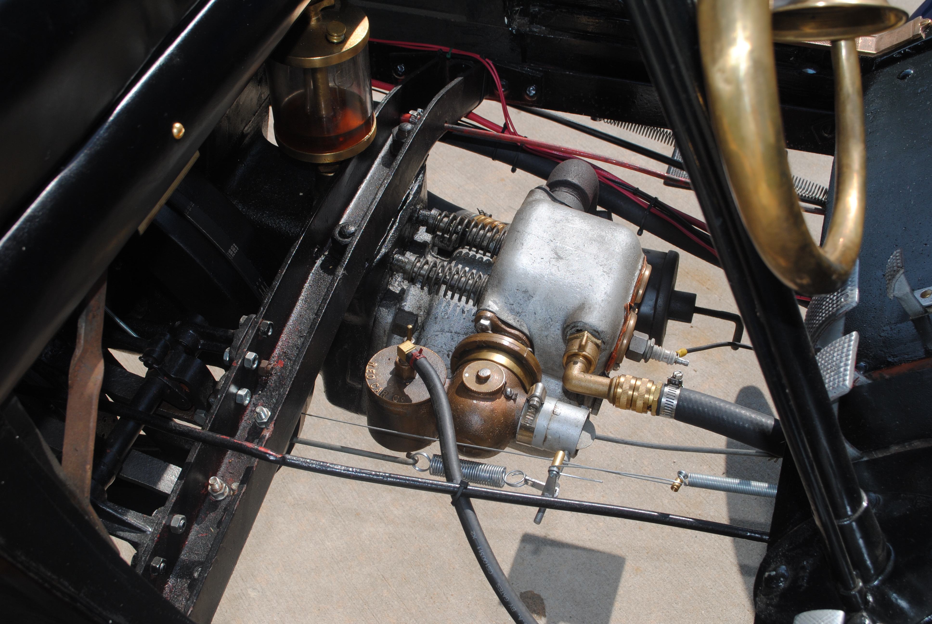 - This car was equipped with a single cylinder, 8 horsepower gasoline engine. In starting the engine, a compression relief valve was installed with a small pedal on the floor board to allow the exhaust valve to open slightly to make cranking the starting handle easier. This system is still operable, however it is not overly difficult to start the car without this compression relief system engaged. All of the original brass cooling lines are present, but the original brass fuel line had damaged connections on each end, and I could not get them to seal tightly enough to prevent fuel leaks, and I subsequently simply replaced this original fuel line with a modern flexible fuel hose and connectors. I still, however, have retained the original fuel line for the next owner, upon request. The following is a fairly comprehensive list of components present on this car that are not original, but are reasonably remanufactured to resemble original components, or were era correct: