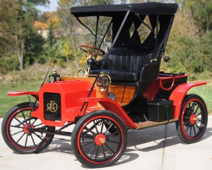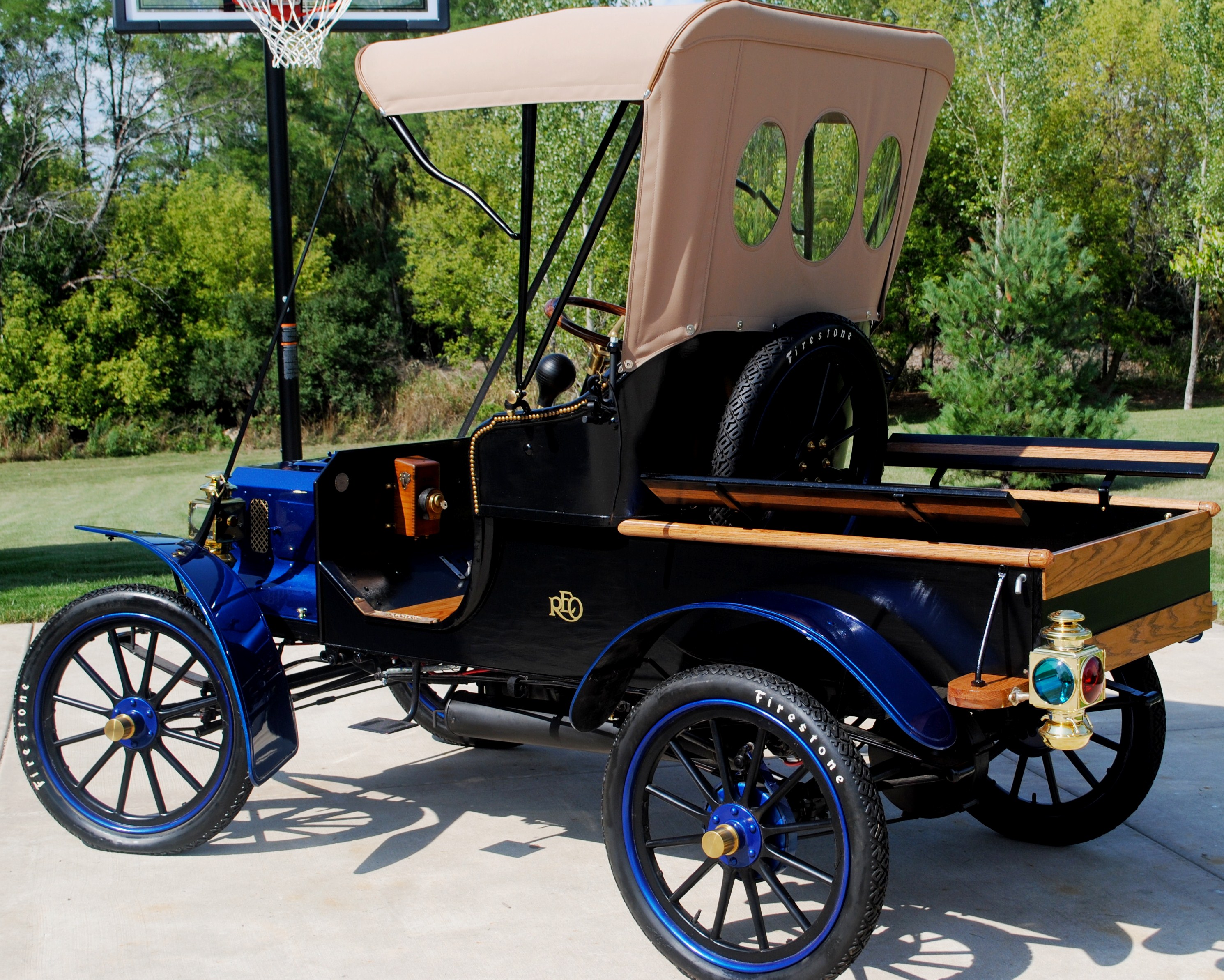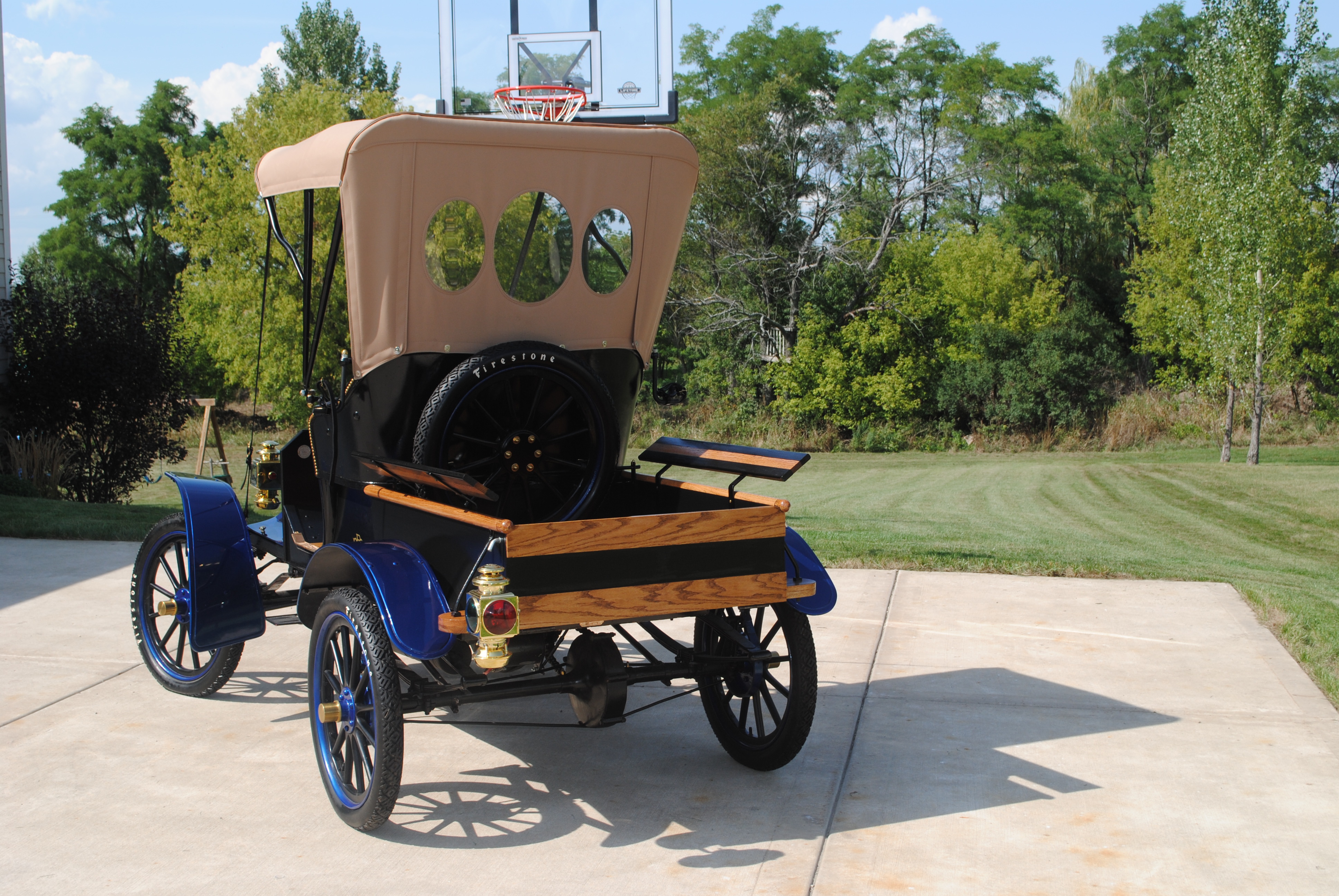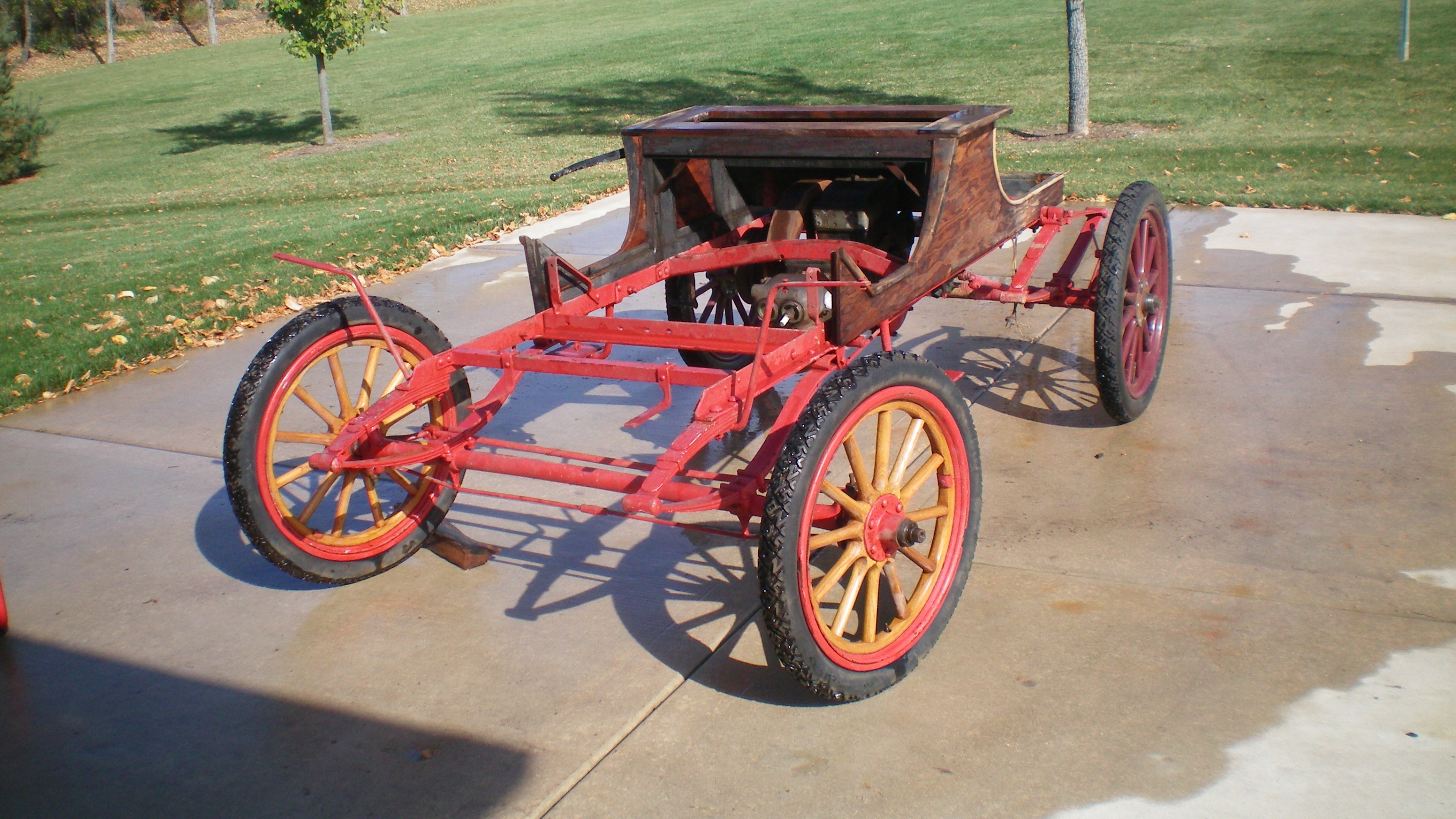 - This car was equipped with a single cylinder, 8 horsepower gasoline engine. In starting the engine, a compression relief valve was installed with a small pedal on the floor board to allow the exhaust valve to open slightly to make cranking the starting handle easier. This system is still operable, however it is not overly difficult to start the car without this compression relief system engaged. All of the original brass cooling lines are present, but the original brass fuel line had damaged connections on each end, and I could not get them to seal tightly enough to prevent fuel leaks, and I subsequently simply replaced this original fuel line with a modern flexible fuel hose and connectors. I still, however, have retained the original fuel line for the next owner, upon request. The following is a fairly comprehensive list of components present on this car that are not original, but are reasonably remanufactured to resemble original components, or were era correct: