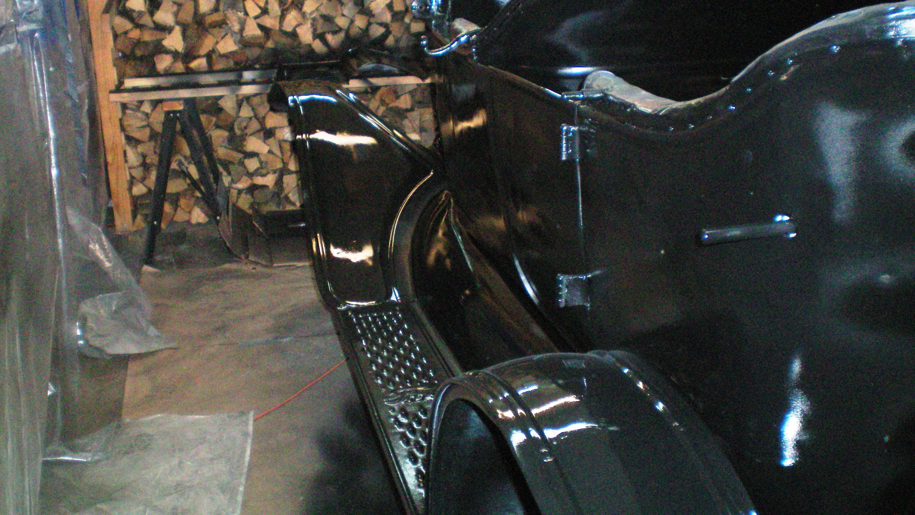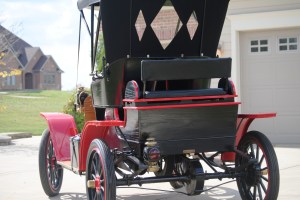 The next step was to remove the fenders from the running boards and frame, and take all of the sheet metal to a local body shop to be repaired and painted ‘Torch Red,’ a GM color that makes the car stand out significantly. I also used the old warped running boards as patterns to construct new oak running boards, and the brass edge trim was salvageable from the old boards and I polished and reattached these trim pieces to the new running boards. The original frame was painted a flat red, although it may have been gloss red back in its day, and had simply faded over the 100 years, I am not certain nor are any of my resources from the various antique car clubs of which I am a member. I have subsequently repainted the frame black, as a few of these cars had black frames originally.