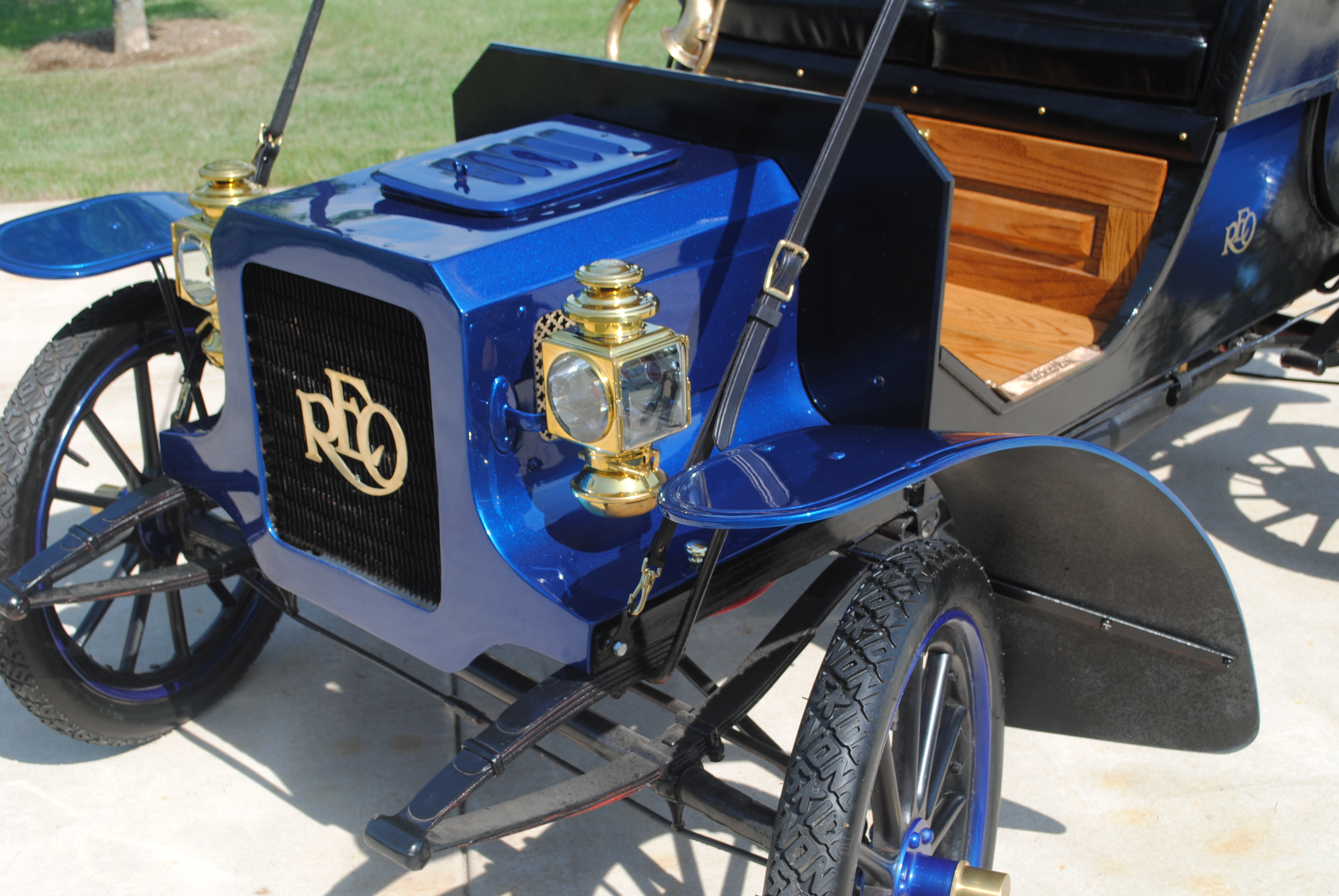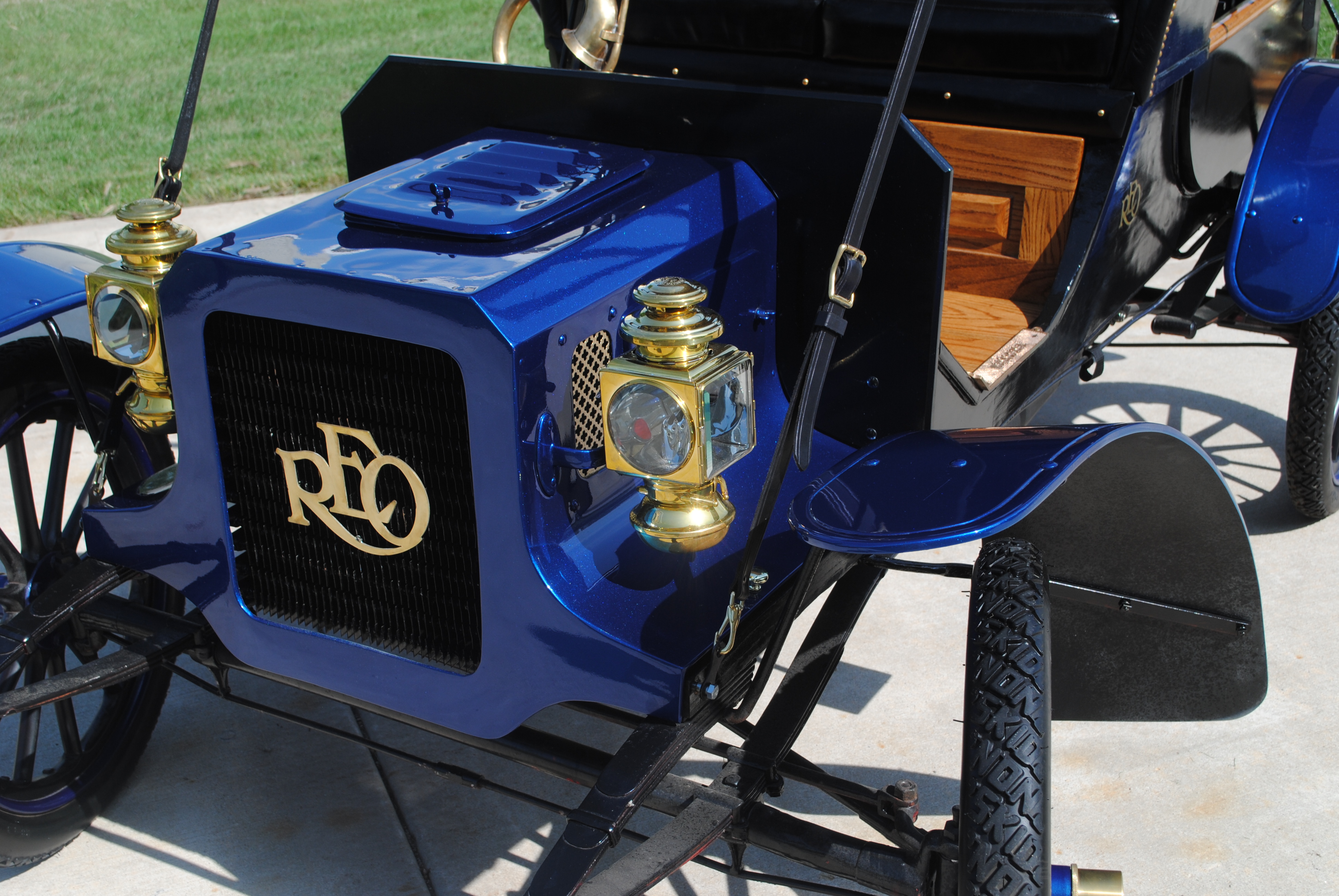 The E&J side and rear lanterns came with this car when I purchased it, and I have had a spirited debate with several members of the REO Club of America as to whether these were original or not in 1908. These lanterns were weathered to the exact same extent as the rest of the car, and the 1908 patent pending label embossed into the tops of each suggests to me that these were original to the car, although the debate rages on.