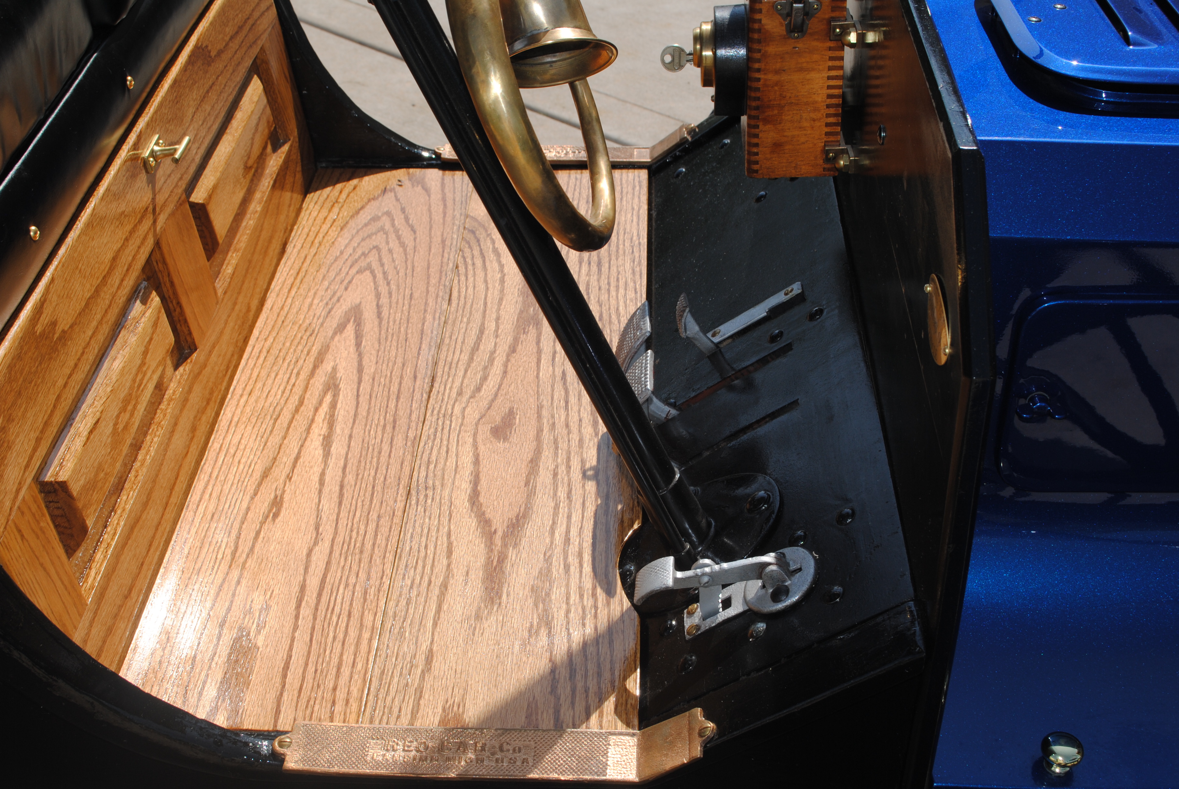 REO cars of this year had a linoleum type of floor covering originally, and I opted to simply showcase the underlying varnished and stained hardwood which REO used, rather than cover this beautiful wood with linoleum.