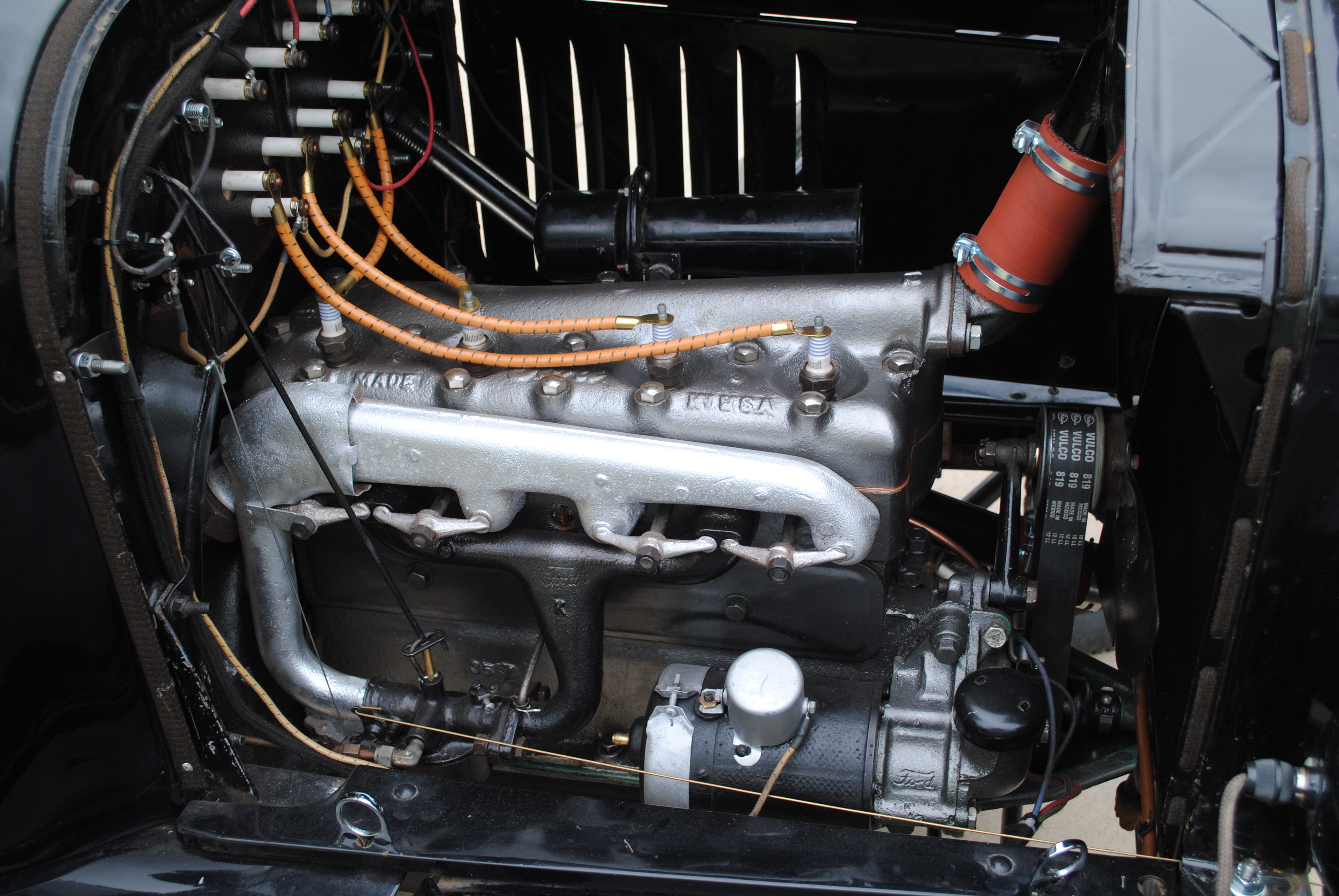 The engine was also never ran up after having been rebuilt, and I disassembled the motor and found that the magneto magnets and coil ring had been removed. I replaced these components with the correct components which I recharged and reconditioned , and the magneto now produces approximately 11 volts AC at an idle, and around 25 volts AC under normal running RPMs: a very powerful ignition system currently. It also has a 6 volt battery with generator and electric starter (neither of these components were OEM to the 1917 model year, but are extremely useful when used for touring and daily driving). I also replaced the piston rings with new specialty rings from Egge Pistons in California, and had honed the cylinders prior to installation. A high compression head has also been added by me to accommodate the increased power from the larger Model A crank and longer compression stroke. The cam has been ground to increase the duration of valve opening, and much larger main bearing caps and bolts/nuts have been installed. A rebuilt Holley NH carburetor has been installed and provides adequate fuel for this 191 cubic inch engine (original block displacement is 177 cubic inches). All of this engine work and machine work is not visible, and accordingly the only visible alterations to this engine are the addition of the generator and cutout as well as the electric starter, the 1/2″ lower cylinder head, and larger main bearing nuts.